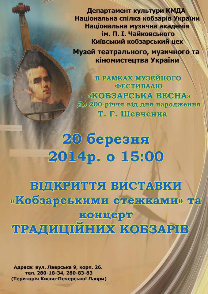 20.03.201420 березня 2014 року о 15:00 відкриється виставка «Кобзарськими стежками» і відбудеться концерт традиційних кобзарів – в рамках музейного фестивалю «Кобзарська весна» до двохсотріччя від дня народження Т. Г. Шевченка.